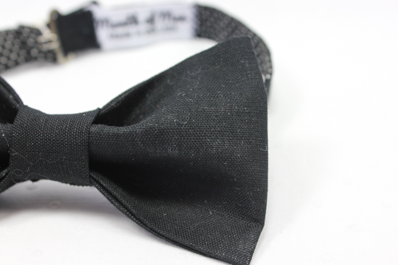 A black bow-tie with black and white polka dot lining, adjustable for size 12"- 20" necks.
