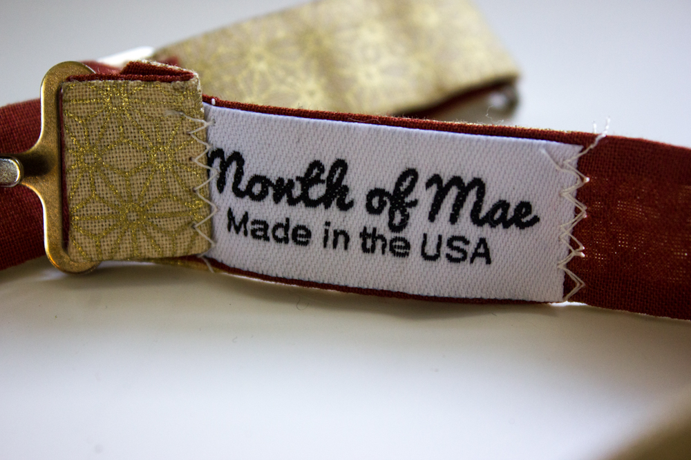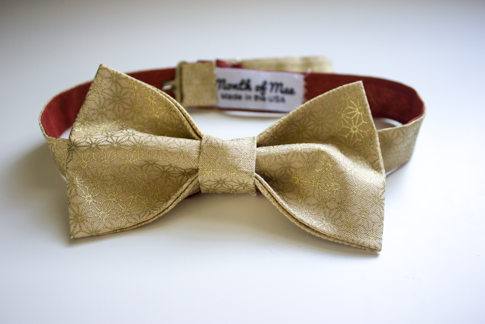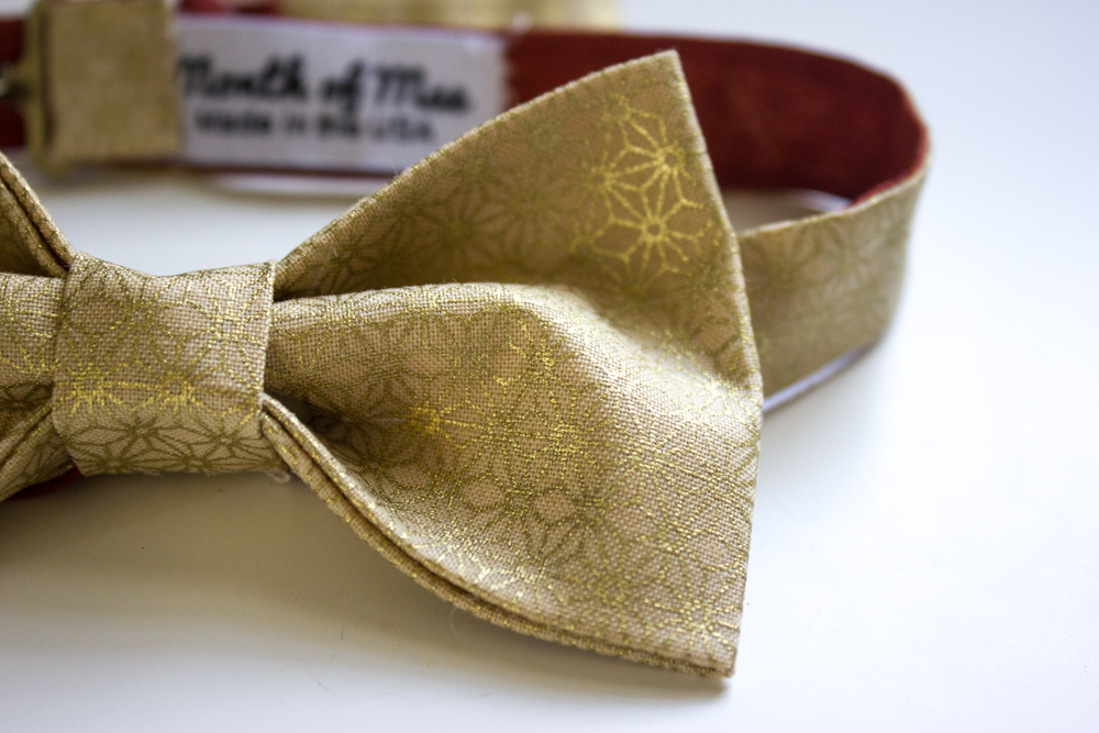 A gold patterned bow-tie with oxblood lining, adjustable for size 12"- 20" necks.
