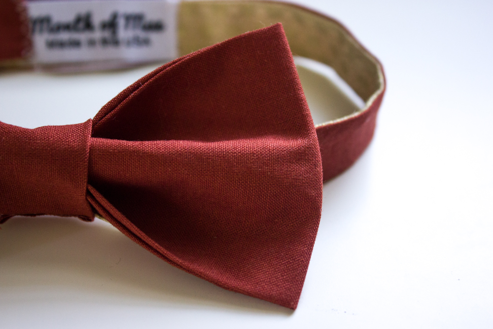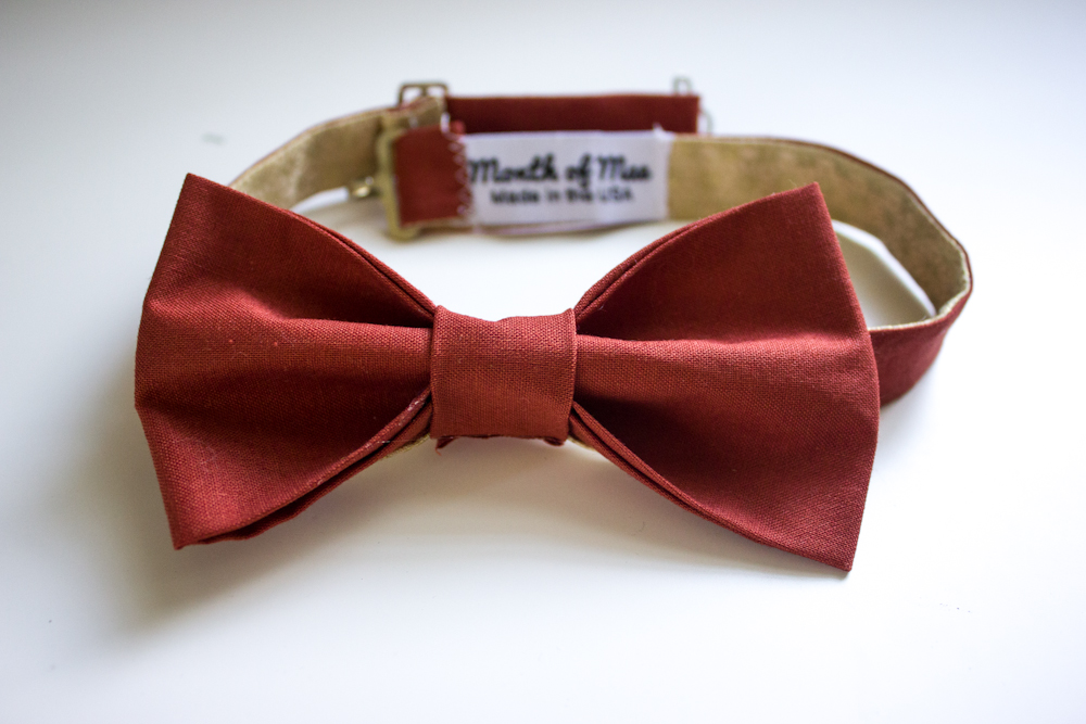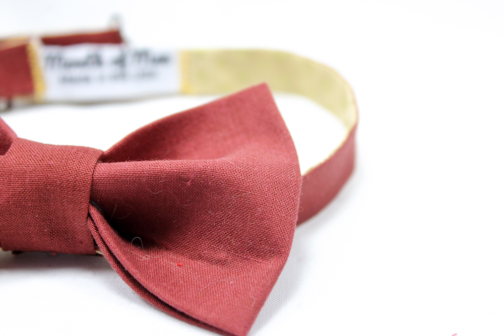 An oxblood bow-tie with gold patterned lining, adjustable for size 12"- 20" necks.