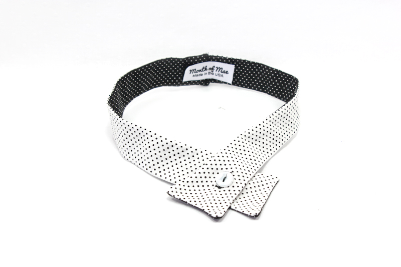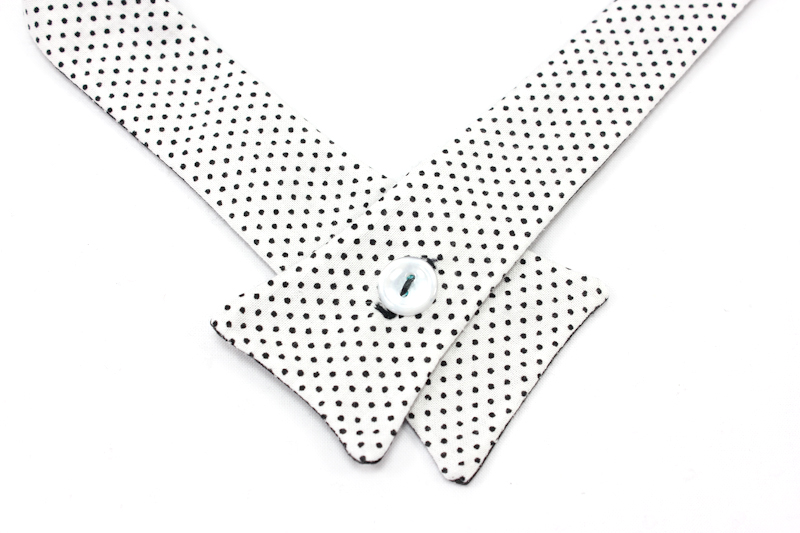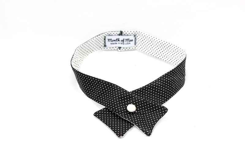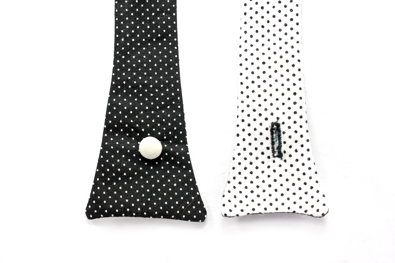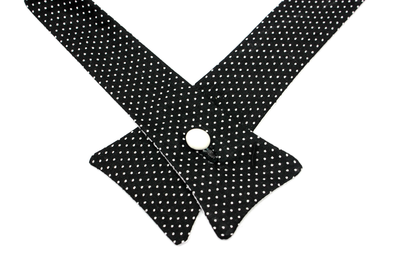 A handcrafted, reversible lady tie - Black with White Polka Dots on one side, White with Black Polka Dots on the other.