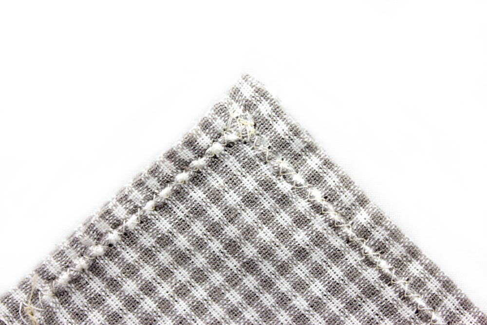 A grey and white gingham pocket square, measuring 10"x10"